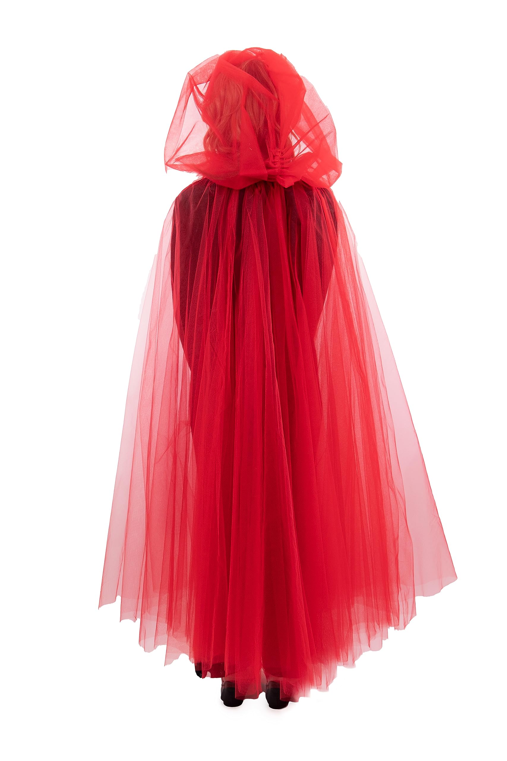 - 50 inches long from shoulder to floor. Machine washable! No itchy underskirts or fabrics. Made from two layers of tulle, oversized, and gathered tulle hood with a satin tie closure.