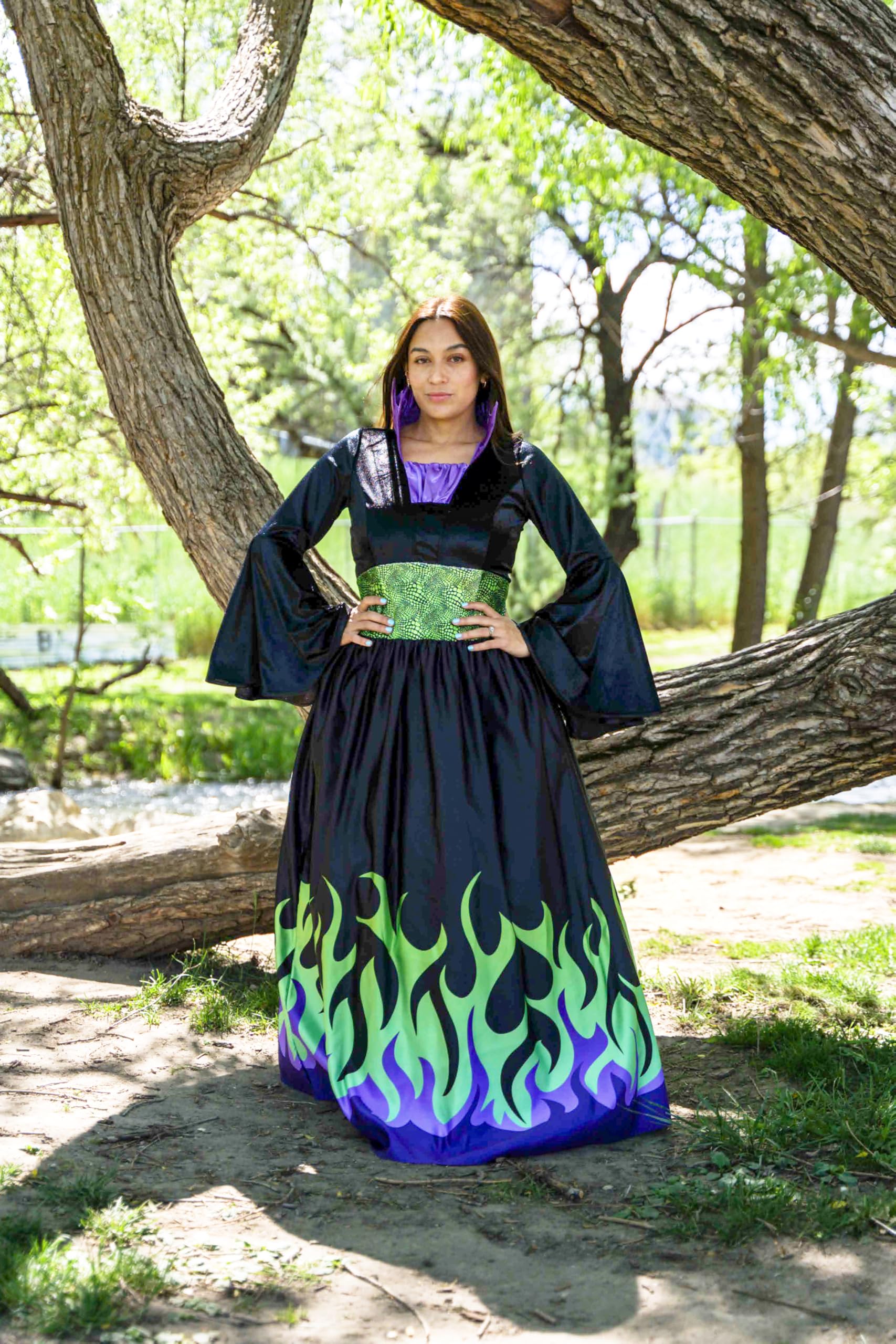 - Embrace your dark side with the Dragon Queen dress, get ready to rule the night with fierce elegance and villainous charm. This gorgeous adult dress includes a black stretch velvet bodice with a purple inset with matching bell sleeves. The Dragon Scale fabric around the waist and flames shooting up from the skirt ads an eye-catching look, and the back of the dress features a lace-up corset to ensure a perfect fit.