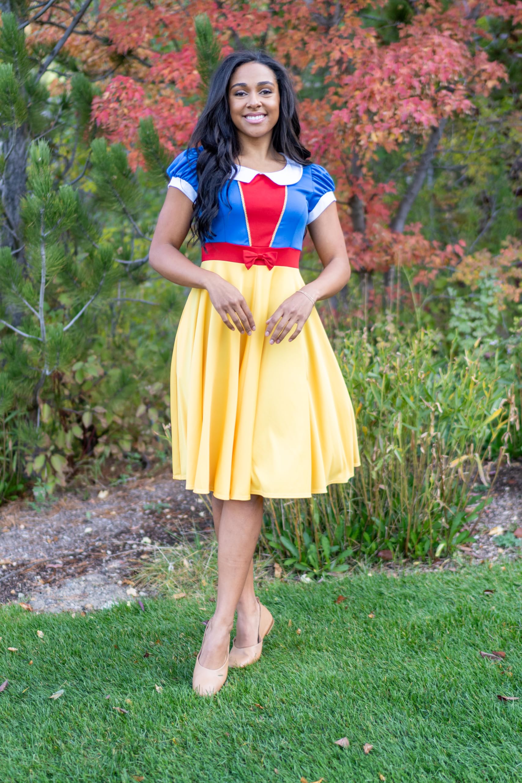- You will be the fairest of them all in this Snow White twirl dress designed for timeless beauty and grace making it perfect for parties, costume events, or simply embracing your inner princess. Designed for twirling - cut from a full circle of fabric which allows it to billow out as your little one spins and dance. Classic Snow White collar and red bodice insert with gold accent trims. Red bow at the waist to tie it all together.